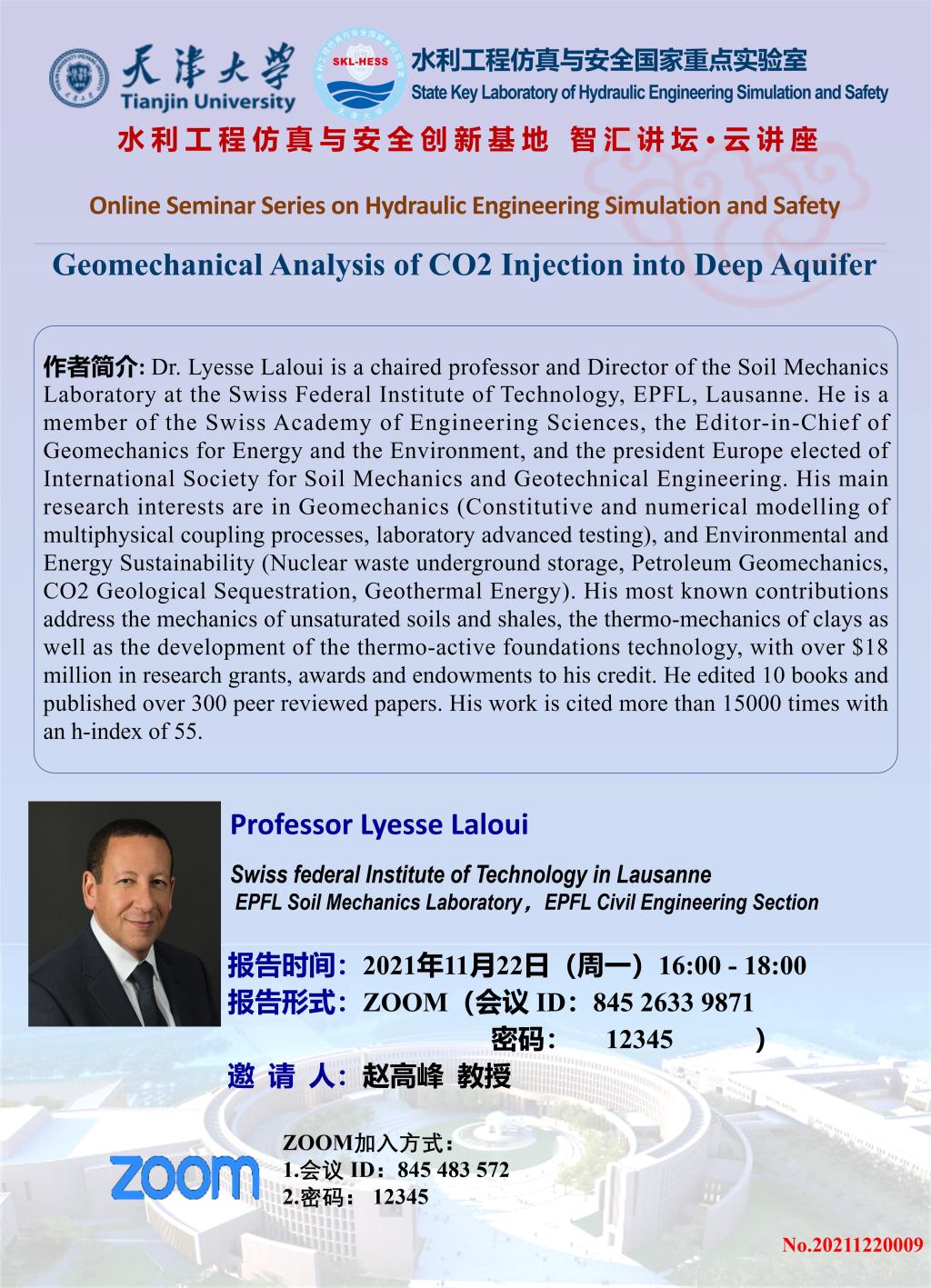 2021年11月22日下午16:00-18:00,瑞士科学院院士、洛桑联邦理工学院Lyesse Laloui教授将通过“云端”为大家带来主题为“Geomechanical Analysis of CO2 Injection into Deep Aquifer”的报告,ZOOM会议 ID 845 2633 9871/密码12345。以下是海报信息,诚邀各位老师和同学参加。