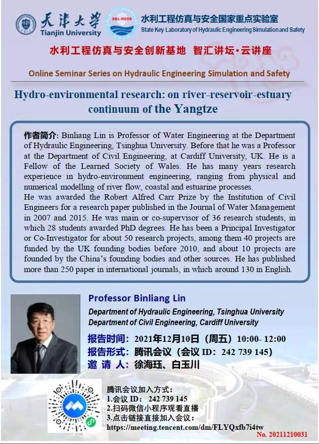 12月10日上午10:00-12:00,英国Cardiff大学Lin Binliang教授将通过“云端”为大家带来主题为“Hydro-environmental research on river-reservoir-estuary continuum of the Yangtze”的报告,腾讯会议 ID 242 739 145。以下是海报信息,诚邀各位老师和同学参加。