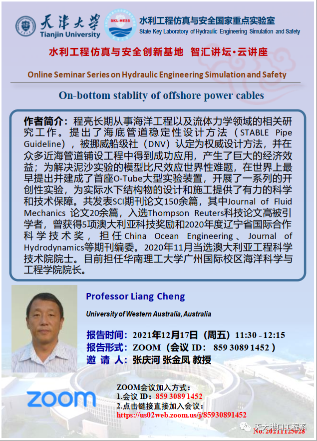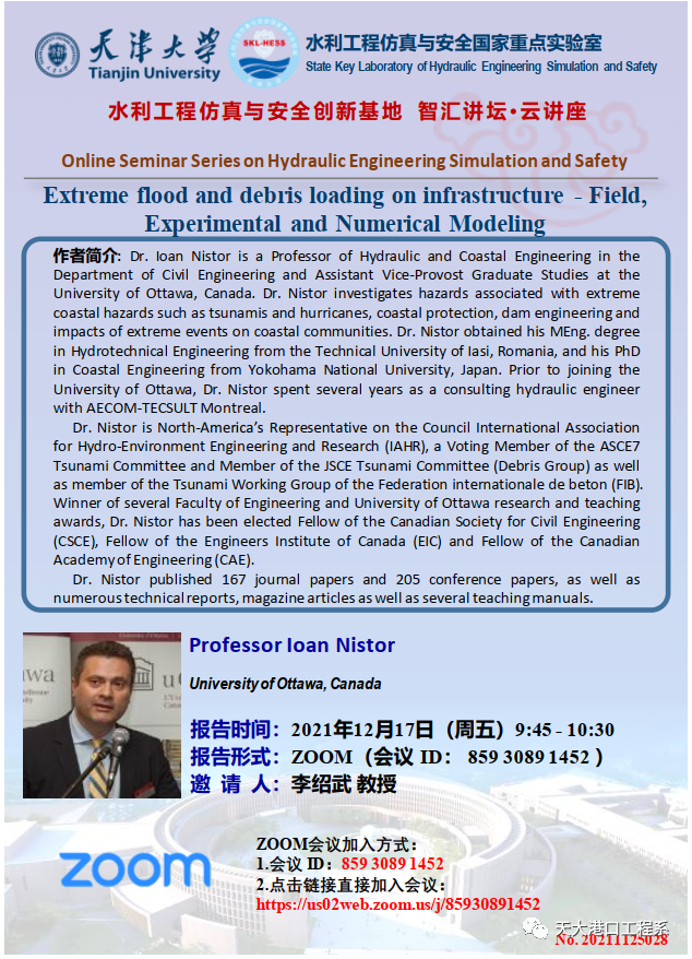 2021年12月17日9:00-17:00,新番 水利工程学科邀请来自美国、英国、加拿大、澳大利亚、日本、中国澳门科研机构的8位著名教授进行“2021 TJU Special Symposium on Coastal and Marine Engineering: Building a Blue-Green Future”研讨会,诚邀各位老师和同学参加,ZOOM ID 859 3089 1452,以下是海报信息。