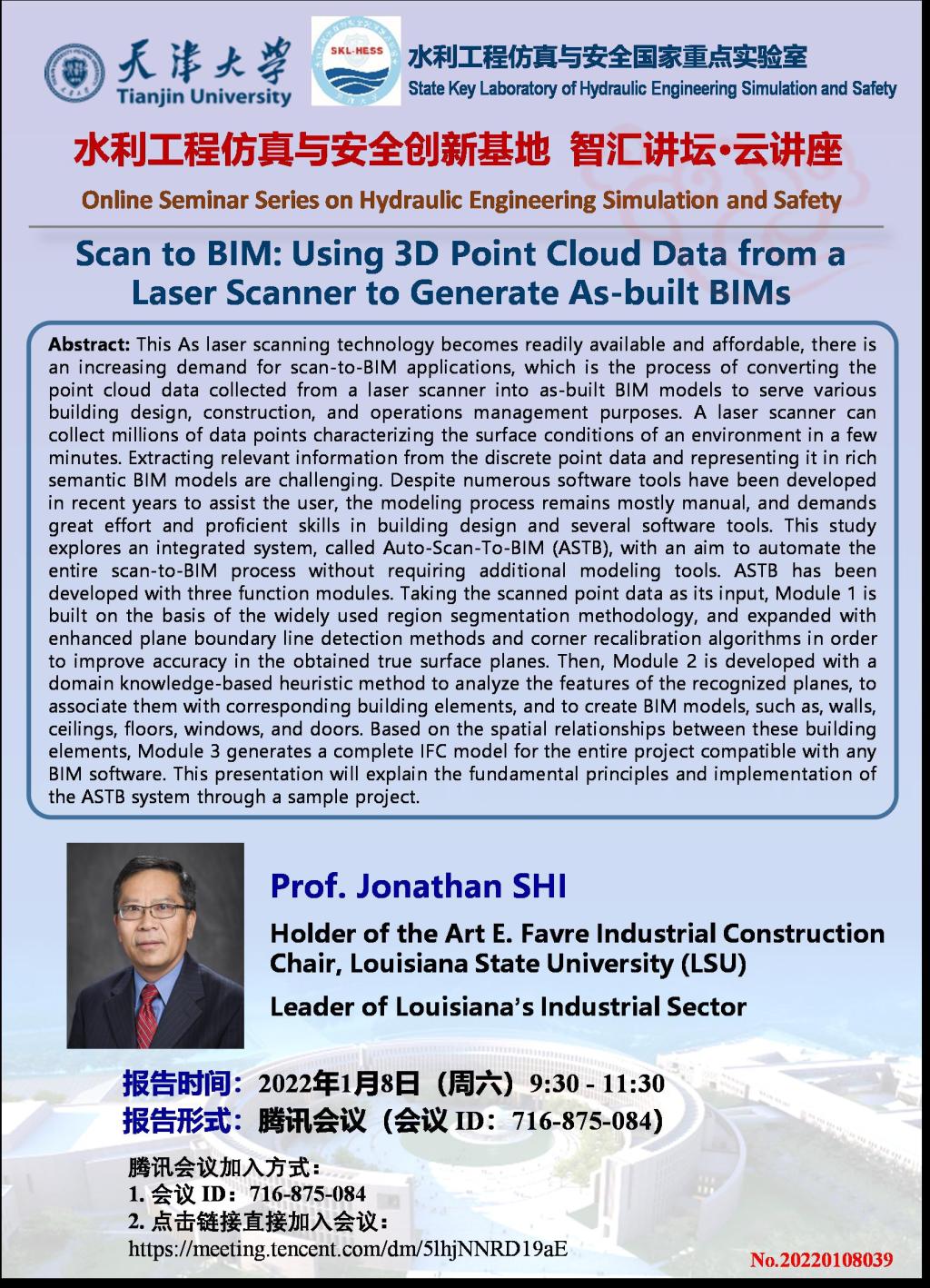 2022年1月8日上午9:30-11:30,美国路易斯安那州立大学Jonathan SHI教授将通过“云端”为大家带来主题为“Scan to BIM: Using 3D Point Cloud Data from a Laser Scanner to Generate As-built BIMs”的报告,腾讯会议 ID 716 875 084。以下是海报信息,诚邀各位老师和同学参加。