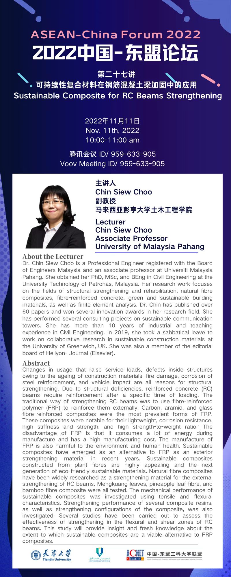 二.2022年11月11日(周五)上午10:00-11:00,主讲人:Chin Siew Choo老师,主题:Sustainable Composite for RC Beams Strengthening,腾讯会议号:959633905。
