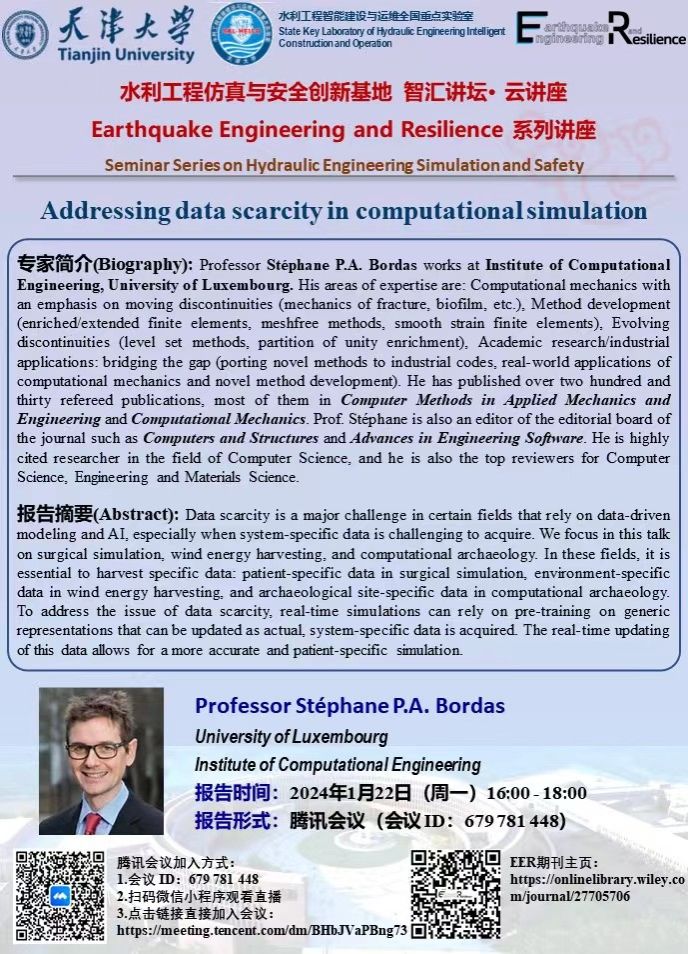 2024年1月22日下午16:00-18:00,卢森堡大学Stephane P.A. Bordas教授将带来《Addressing data scarcity in computational simulation》前沿学术讲座,诚邀各位老师和同学参加。腾讯会议ID:679 781 448。