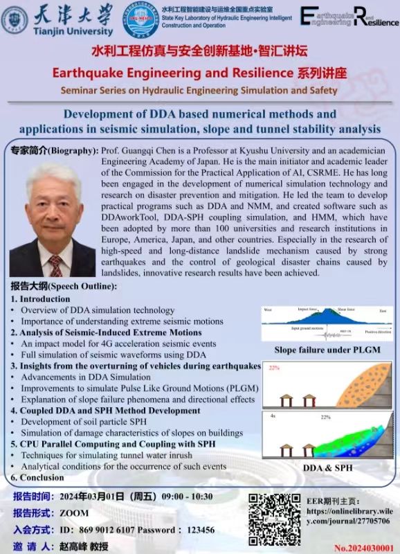 2024年3月1日上午9:00-10:00,日本工程院院士、教育部长江学者讲席教授陈光齐院士将带来《Development of DDA based numerical methods and applications in seismic simulation, slope and tunnel stability analysis》的前沿学术讲座,诚邀各位老师和同学参加。