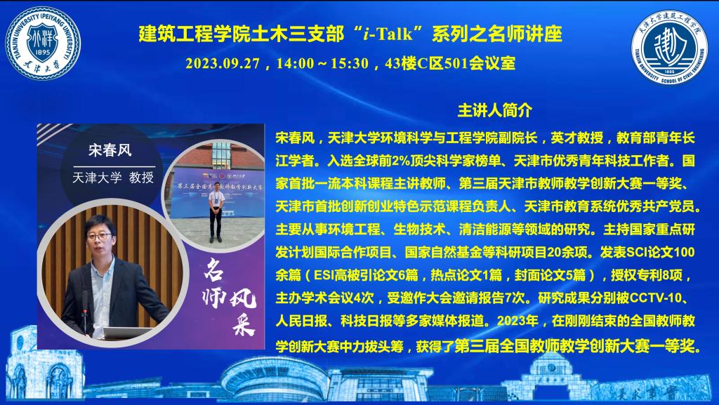 为了提升进一步提升教学质量,切实做好‘经师’和‘人师’的统一,土木三支部“i-Talk”系列之“教学明星经验交流会”于2023年9月27日成功举办。此次讲座邀请到来自新番 环境科学与工程学院副院长,英才教授、教育部青年长江学者宋春风教授,进行题为“新工科背景下专业课程的教学创新与实践”的精彩报告。此次活动土木三支部联合土木一支部、二支部和建2021级硕士生硕士二班党支部联合开展。