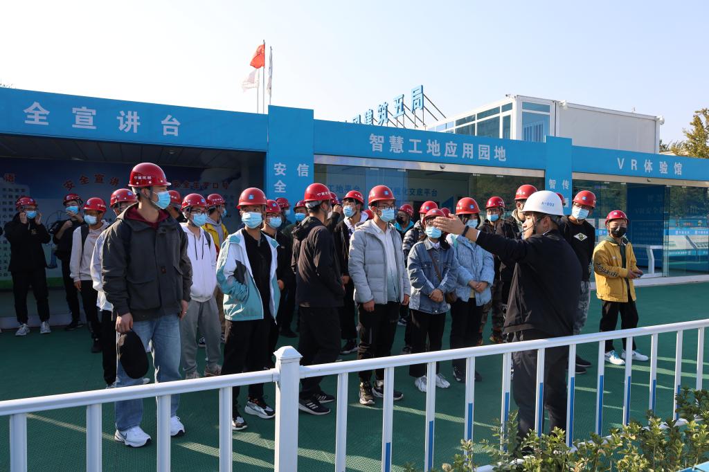 在项目现场安全交底后,项目经理王星辉带领同学们参观了天津地铁7号线项目现场,近距离观摩了地铁工程的施工概况,通过三箱两室、展板、车站主体基坑、八里台立交桥、钢筋加工区的介绍,加深了同学们对土建类行业的了解。