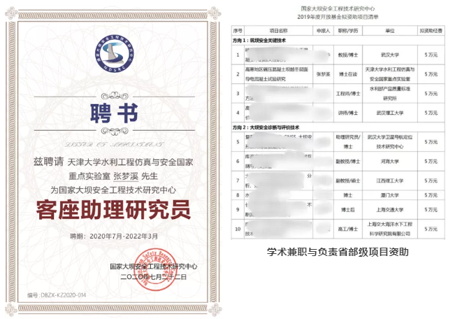 目前主持或参与科研项目5项,其中作为项目负责人主持长江勘测规划设计研究院国家大坝安全工程技术研究中心开放基金项目“高寒地区碾压混凝土坝越冬层面导电混凝土试验研究”(项目负责人),实际上在申请这项基金前我并未抱有任何期望,按照思维惯性,在读博士很难在与教授们、“青椒”们的项目评选中保持竞争力,但李老师劝我敢于尝试,并将申请书反复修改推敲多次后提交,最终也是成为目前唯一一位承担国家大坝中心这一开放基金项目的在读博士,并获聘“国家大坝安全工程技术研究中心客座助理研究员”。除此之外,李老师大力支持我在研究生期间参与学术交流活动,包括:中国大坝工程学会学术年会、第七届水利工程领域高层(院士)论坛、水工结构工程青年学者学术交流会、现代混凝土的微观结构测试与分析学术研讨会等,我也曾受邀参加在2019中国力学大会(CCTAM),并作题为“考虑等几何分析的混凝土重力坝变形安全预测分析”的学术报告。