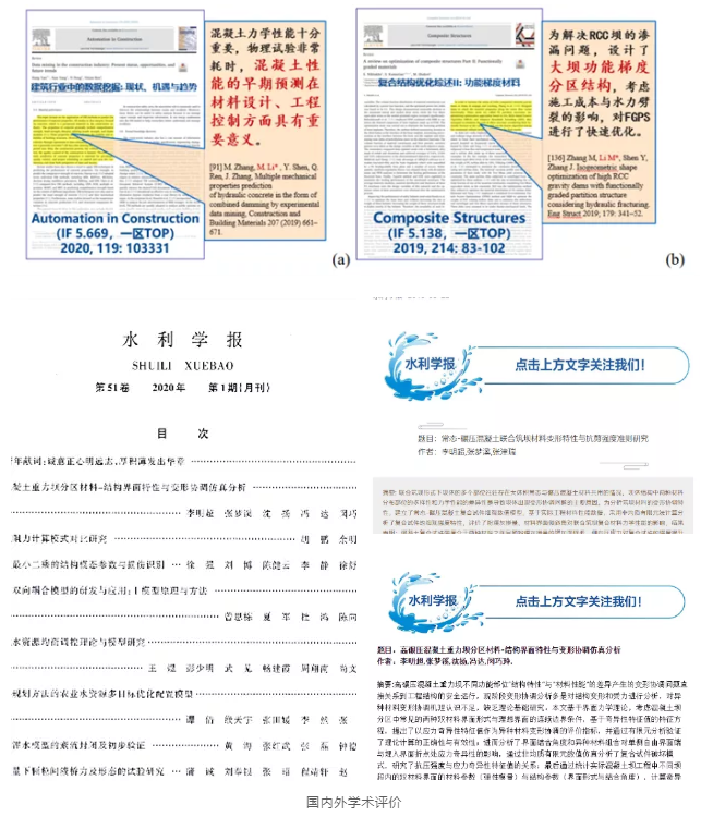 研究生学习期间,在导师的悉心指导下,共发表论文22篇,其中以第一、通讯作者或第二作者(导师一作)的身份发表高水平学术论文13篇,其中SCI论文7篇(均为TOP期刊),已授权或公开国家发明专利8项,相关成果主要发表在《Engineering Structures》《Construction and Building Materials》《Advanced Engineering Informatics》等期刊上,文章多次被国际专家整段引用,如:国际复合结构领域专家Saeed Kamarian在《Composite Structures》发表的综述论文将本人提出的高碾压混凝土重力坝功能梯度分区结构作为代表性进展进行整段介绍,充分肯定了该成果的价值;发表在《Automation in Construction》的综述文章《建筑行业中的数据挖掘》大篇幅引用了本人水工混凝土多力学性能智能挖掘的成果,认为“混凝土性能的早期预测在材料设计、工程质量、进度和成本控制方面具有重要意义”,对本人研究成果作出充分肯定。中文论文主要发表在水利行业创刊最早且最具影响力的顶级期刊《水利学报》上,其中2篇文章被编辑部推荐为重点导读文章,1篇文章作为2020年第一期第一篇学术论文在《水利学报》上发表,凭借丰硕的学术成果先后两次获研究生国家奖学金,获得国家留学基金委资助出国的2020联合培养博士资格,获2020年获新番 优博基金以及2021博士学位论文国际评审项目资助,同时从进入研究生阶段以来,连续五年均获得一等学业奖学金。