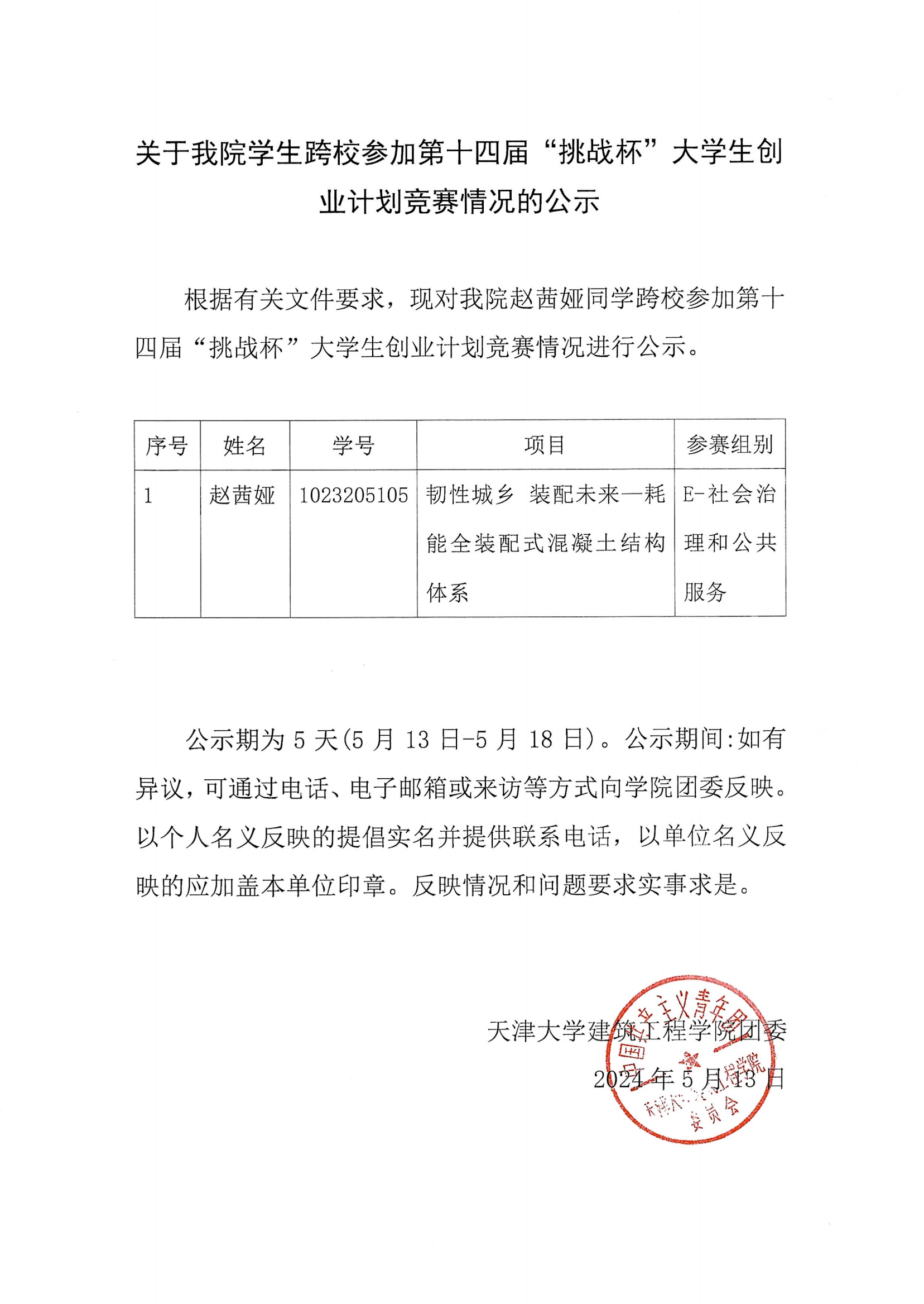 根据有关文件要求,现对我院赵茜娅同学跨校参加第十四届“挑战杯”大学生创业计划竞赛情况进行公示。公示期为5天(5月13日-5月18日)。公示期间,如有异议,可通过电话022-27401051、电子邮箱[email protected]或来访43楼C512等方式向学院团委反映。以个人名义反映的提倡实名并提供联系电话,以单位名义反映的应加盖本单位印章。反映情况和问题要求实事求是。