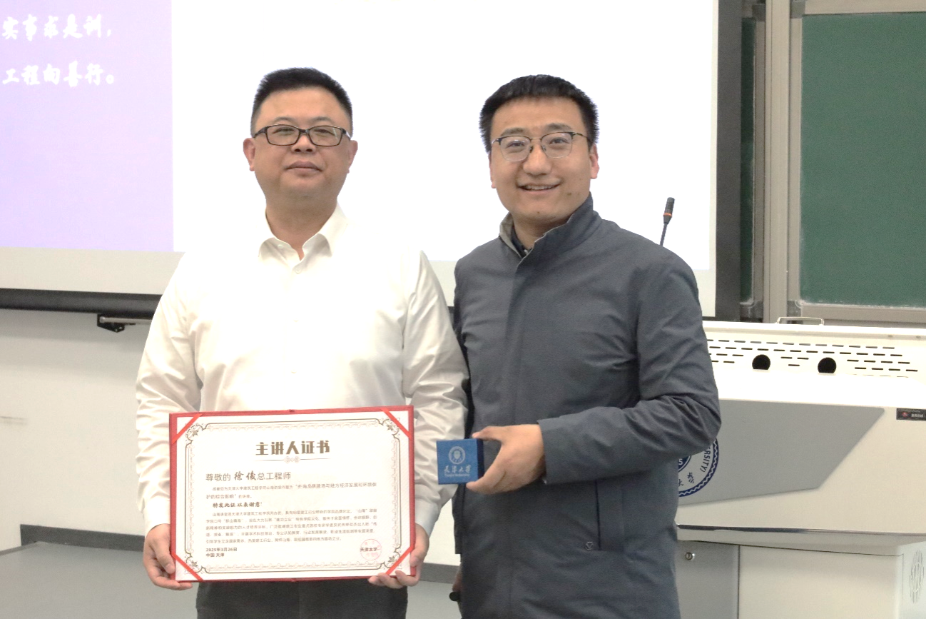 随后,徐俊总工程师做了题为“外海岛礁建港的工程伦理思考——港口工程设计与多维度价值平衡”的精彩报告。他通过详实的亲身实践案例分析,系统阐释了外海岛礁建港工程的战略背景、技术特征及面临的伦理挑战。他以工程建设与当地社区权益冲突、生态保护与工程开发矛盾等典型案例为切入点,深入剖析了工程实践中经济效益、社会责任与生态价值的辩证关系,并分享了生态补偿机制、新型桶式基础结构技术等创新解决方案,结合实际工程案例,为新番 研究生讲授了国家重大工程建设中的伦理问题。报告中,徐俊总工程师结合从业多年的工程实践感悟,以“千秋邈矣留鬼斧,百战归来再读书;三问实事求是训,一生工程向善行”的箴言寄语青年学子,强调工程师应秉持工程向善的初心,在工程全生命周期中践行可持续发展理念。在互动环节,主讲人针对利益相关者参与、港口工程建设难点、结构防灾减灾、建筑工程师如何秉持初心等问题与现场师生进行了充分交流,与会师生纷纷表示受益匪浅,收获颇丰。最后,黄晓伟老师作为学校代表,为徐俊总工程师颁发了主讲人证书和专门订制的“工程师之戒”。