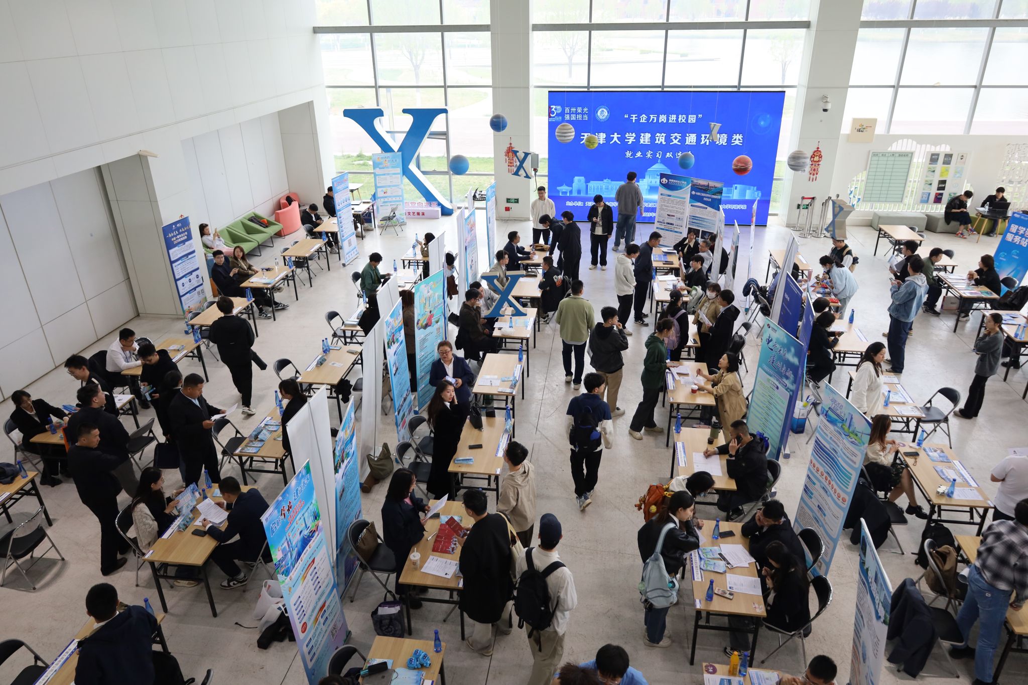 北洋园校区大通学生中心A区大厅举行,五十余家重点单位积极参与招聘,校内外千余名建筑交通环境类相关专业学生到场求职。