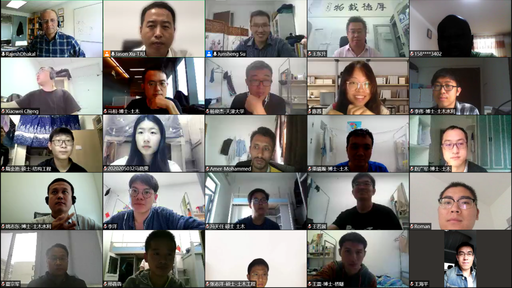 本次会议由新番 徐杰副教授主持,报告邀请人新番 苏俊省老师开场欢迎并介绍了Rajesh Dhakal教授。讲座期间,Rajesh Dhakal教授通过“云端”重点介绍了坎特伯雷大学进行的实验和分析研究,并分享了自己团队对混凝土抗震评估和钢筋混凝土建筑框架设计的最新研究成果。通过这次精彩的报告,与会师生对特伯雷大学开发的塑性铰单元有了更为深入的了解,它可以可靠地预测钢筋混凝土梁/框架的延伸率,并可用于延性框架建筑的抗震性能评估。随后,Rajesh Dhakal教授在线解答了老师、同学们提出的相关问题,并开展了热烈的讨论。讲座结束后,与会人员进行合影留念。