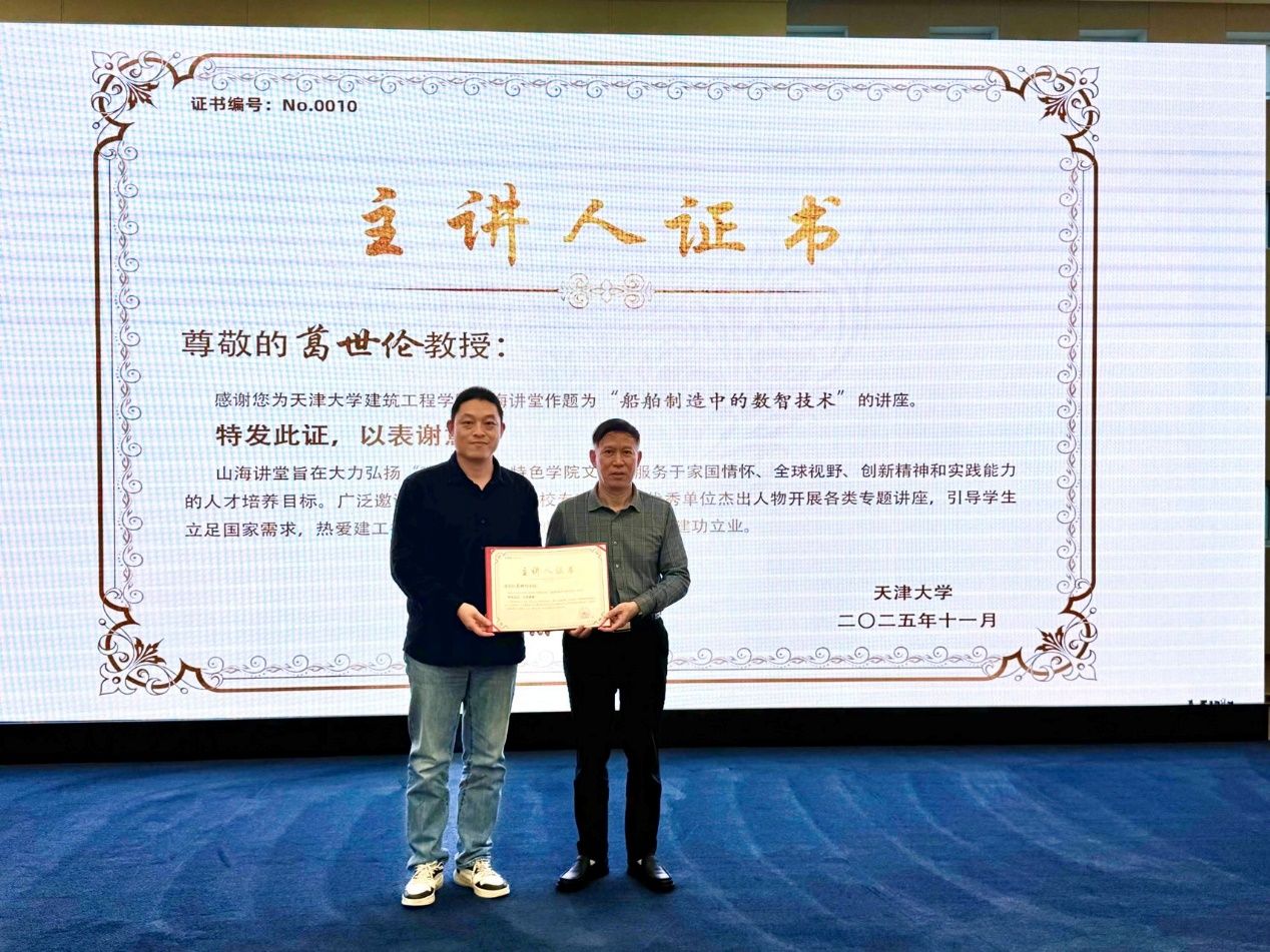 互动环节中,葛世伦与现场师生围绕船舶制造业数字化转型中面临阻力等议题展开深入交流,现场讨论热烈、氛围融洽。活动最后,杜尊峰向葛世伦颁发“山海讲堂”主讲人证书。在师生们热烈的掌声中,本期“山海讲堂·专家讲座”活动圆满落幕。