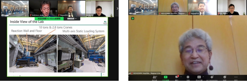 何理教授和長江副教授分别介绍了双方参会人员,何理教授代表学院对名古屋大学参会专家表示诚挚欢迎,并对签署学术交流与合作协议、学生交换备忘录情况进行介绍。日方专家表达了对学院的邀请及热情接待的感谢,对名古屋大学环境学研究科现状进行介绍。西澤教授使用中文介绍了名古屋大学环境学研究科及对亚洲建筑的研究;小松教授介绍名古屋大学建筑系并讲述其与新番 合作10年的故事;长江副教授介绍了在大型振动台试验方面的国际合作以及联合培养学生情况;荒木教授表达了与新番 进行新材料联合研究的美好愿景;日比野副教授介绍了名古屋大学的结构工程实验室。师燕超教授向对方介绍了新番 的基本情况,包括历史沿革、人才培养、师资建设、科学研究、国际合作交流等。