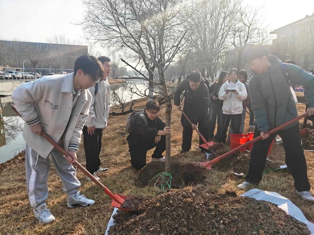 师生们分工明确、默契协作,迅速投入到植树劳动中。在专业园林老师的悉心指导下,大家严格遵循种植规范,从挥锹铲土、扶正树苗,到填土踩实、提水浇灌,每一个环节都一丝不苟、有条不紊全力保障每一棵树苗都能扎根沃土、茁壮成长。